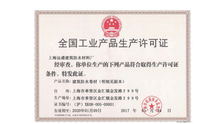 公司自粘聚合物改性沥青聚氨酯防水卷材被国家质量监督总局审查通过,获得“全国工业产品生产许可证”。