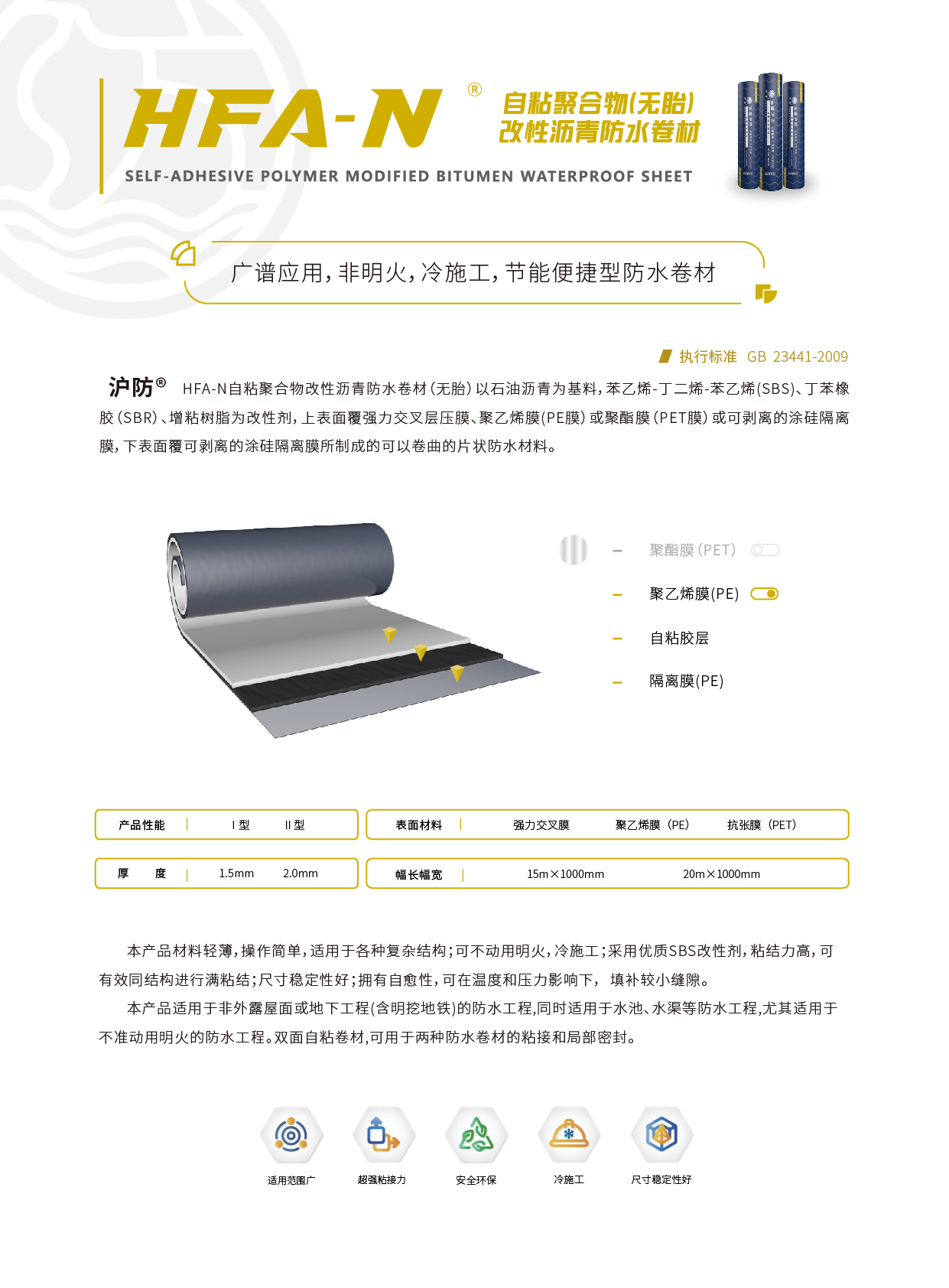 HFA-N 自粘聚合物(无胎)改性沥青防水卷材以石油沥青为基料,苯乙烯-丁二烯-苯乙烯(SBS)、丁苯像胶(SBR )、增粘树脂为改性剂,上表面覆强力交叉层压膜、聚乙烯膜(PE膜)或聚酯膜(PET膜)或可剥离的涂硅隔离膜,下表面覆可剥离的涂硅隔离膜所制成的可以卷曲的片状防水材料。