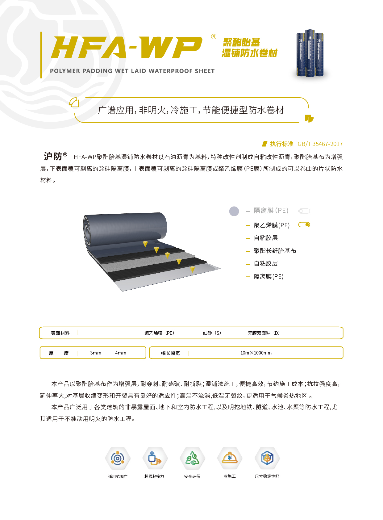 HFA-WP聚酯胎基湿铺防水卷材以石油沥青为基料,特种改性剂制成自粘改性沥青,聚酯胎基布为增强层,下表面覆可剩离的涂硅隔离膜,上表面覆可剥离的涂硅隔离膜或聚乙烯膜(PE膜)所制成的可以卷曲的片状防水材料。