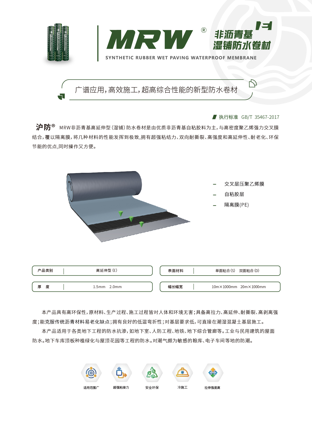 MRW 非沥青基高延伸型湿铺防水卷材是由优质非沥青基自粘胶料为主,与高密度聚乙烯强力交叉膜结合,覆以隔离膜,将几种材料的性能发挥到极致,拥有超强粘结力、双向耐撕裂、高强度和高延伸性、耐老化、环保节能的优点,同时操作又方便。