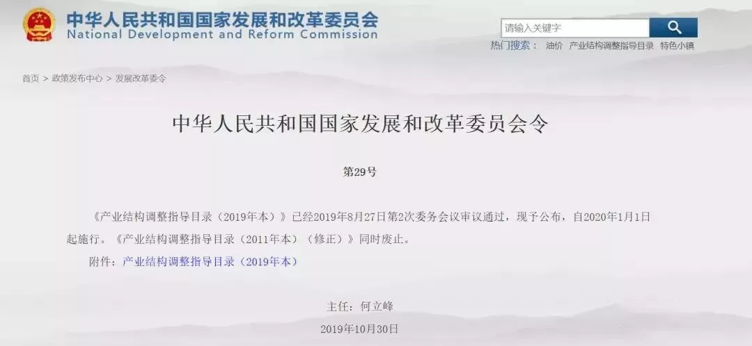 11月6日,国家发改委官网发布了《中华人民共和国国家发展和改革委员会令(第29号)》,公告中指出:“《产业结构调整指导目录(2019年本)》已经2019年8月27日第2次委务会议审议通过,现予公布,自2020年1月1日起施行。《产业结构调整指导目录(2011年本)(修正)》同时废止。”