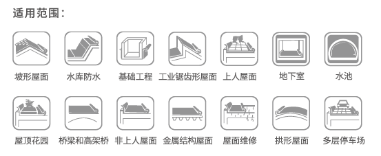 而MRW因自身良好的特性,适用范围极广,包括坡形屋面、水库防水、基础工程、工业锯齿形屋面、上人屋面、地下室、水池、屋顶花园、桥梁和高架桥、非上人屋面、金属结构屋面、屋面维修、拱形屋面、多层停车场等多种场景。