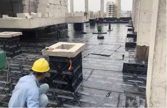 (2)管根卷材附加层必须严格按工艺要施工,两层附加层,其中一层的一半剪成条状与基层粘贴,另一半卷上管根部(高度大于250mm),搭接不少于100mm,另一附加层压在锯齿上将缝隙遮挡;