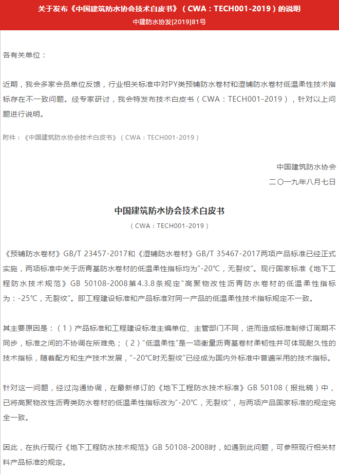 新的预铺湿铺标准低温柔性为-20℃,但是地下规范要求是-25℃,因此近期防水协会出来了一份白皮书,表示以后的地下规范(正在送审中)也会按照-20℃的标准来实施,希望同行们相互转告!