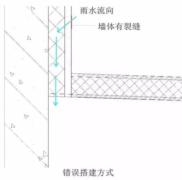很多搭建彩钢房的工人会忽略防水问题,他们通常将阳光房与彩钢房直接对接在建筑物饰面层上,并不对墙体进行开槽处理。在外墙有保温层的情况下,一旦后期在保温内有水窜下来,就可能引起渗漏。渗漏示意图如下: