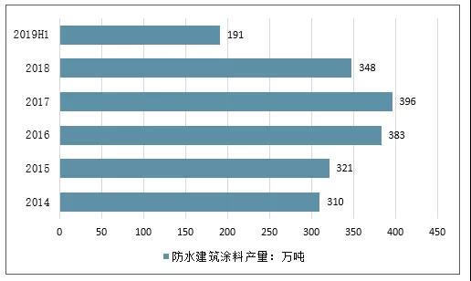 2019年上半年,防水建筑涂料产量达到191万吨。在我国建筑涂料产量中,防水建筑涂料占比最高,约占60%。