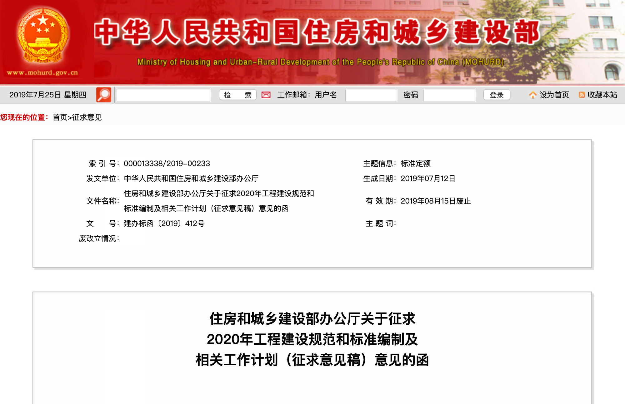 为满足工程建设需要,落实工程建设标准体制改革总体要求,根据工程建设规范体系表和2019年标准复审意见,日前,住房和城乡建设部会同有关部门和行业标准化管理机构,研究提出了《2020年工程建设规范和标准编制及相关工作计划(征求意见稿)》,并征求意见。