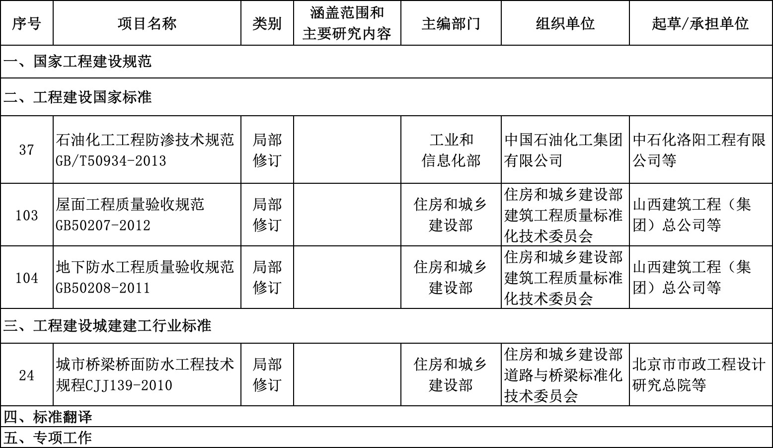 据统计,《2020年工程建设规范和标准编制及相关工作计划(征求意见稿)》中,共研编国家工程建设规范40项,局部修订工程建设国家标准107项,局部修订工程建设城建建工行业标准36项,标准翻译5项,专项工作50项。其中,涉及防水行业的这些标准即将修订:标准工程建设国家标准中的《石油化工工程防渗技术规范》(GB/T 50934-2013)、《屋面工程质量验收规范》(GB 50207-2012)、《地下防水工程质量验收规范》(GB 50208-2011),工程建设城建建工行业标准中的《城市桥梁桥面防水工程技术规程》(CJJ139-2010)。