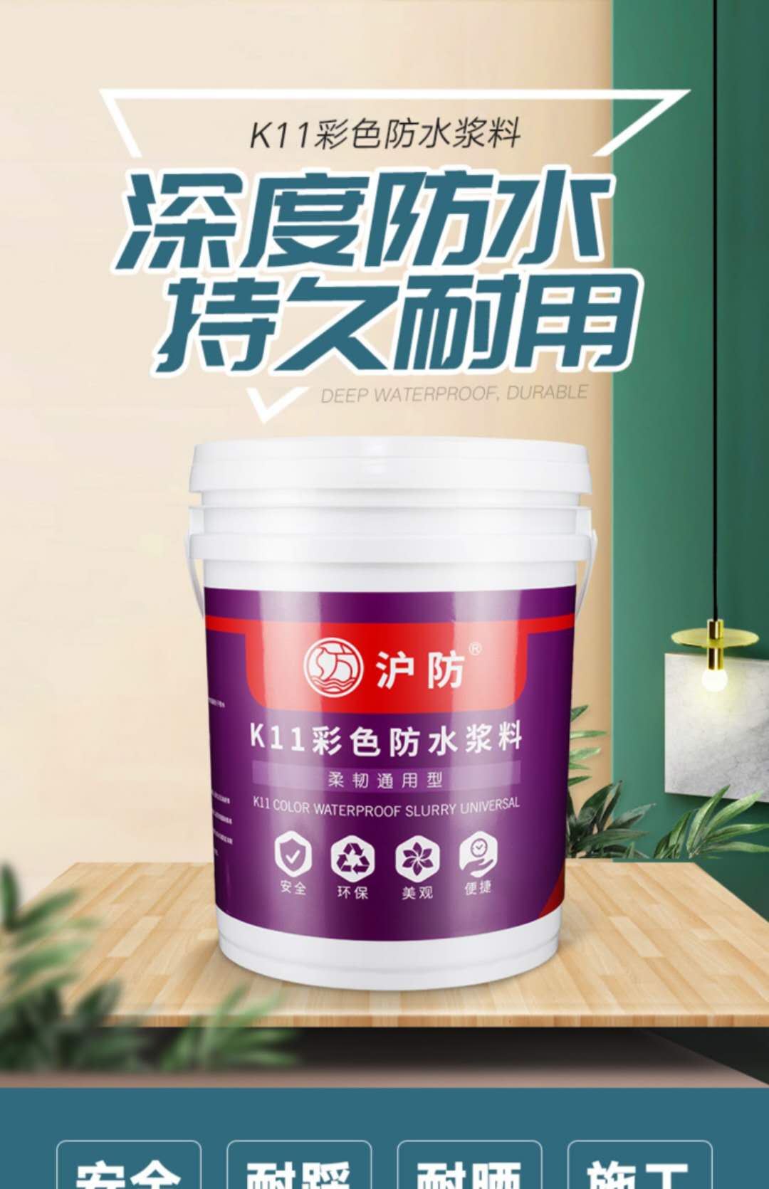 图为沪防K11柔韧通用型彩色防水涂料展示,涂刷性更佳,不流挂,不堆积,干燥快。