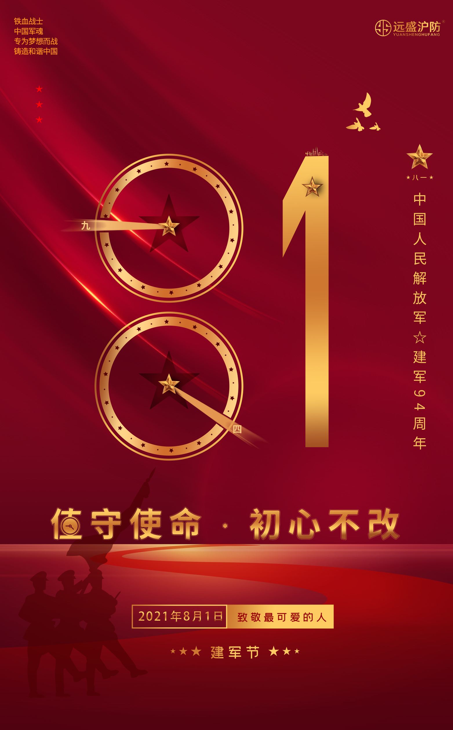 【远盛沪防】以八一建军为榜样,努力学习他们不畏困难、坚守使命、初心不变、岁月不改的奋斗精神,我们将在未来的工作中勇往直前,恪守“赋能建筑,岁月值守”的企业使命,以实业报国,为大国繁荣添砖加瓦。