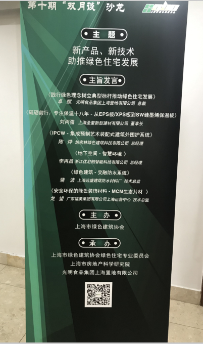 第十期沙龙活动由上海市绿色建筑协会主办,协会绿色住宅专业委员会、上海市房地产科学研究院和光明食品集团上海置地有限公司承办。以“新产品、新技术,助推绿色住宅发展”为主题,邀请业内多家绿色住宅开发建设和运营企业的代表与专家与会员单位代表进行了深入的交流与探讨。上海远盛是本次沙龙的会员单位之一。活动由市房科院总师办主任古小英主持。