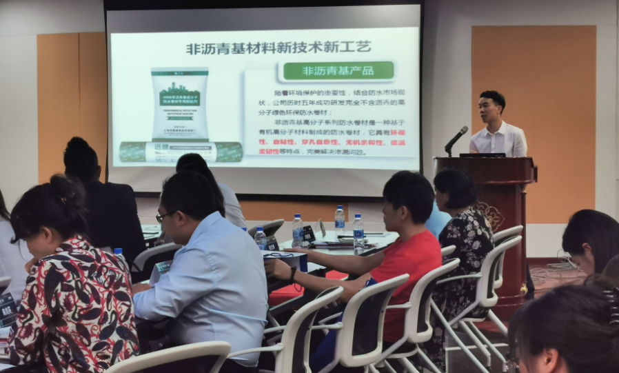 这次出席活动代表发言的是我们公司的技术总监,以《绿色建筑-交融防水系统》为题,介绍了我们自主研发的新产品-MRW非沥青基自粘防水卷材,推出了交融式防水服务系统。会上介绍了非沥青基材料新技术、新工艺,非沥青基高分子湿铺自粘防水卷材的性能要求,以及湿铺法和干铺法相结合的施工工艺。