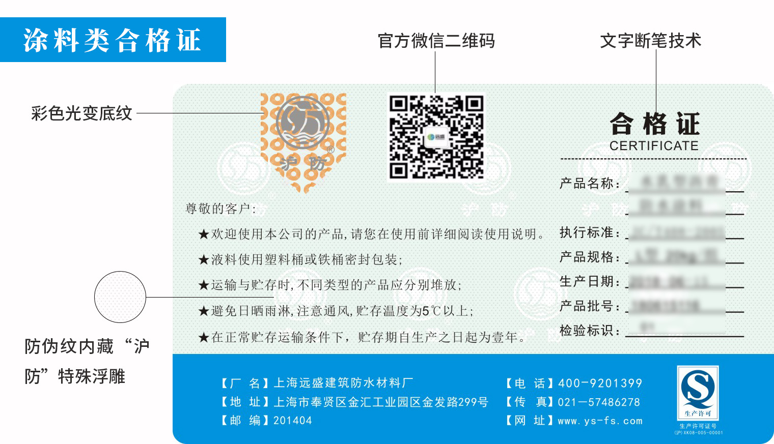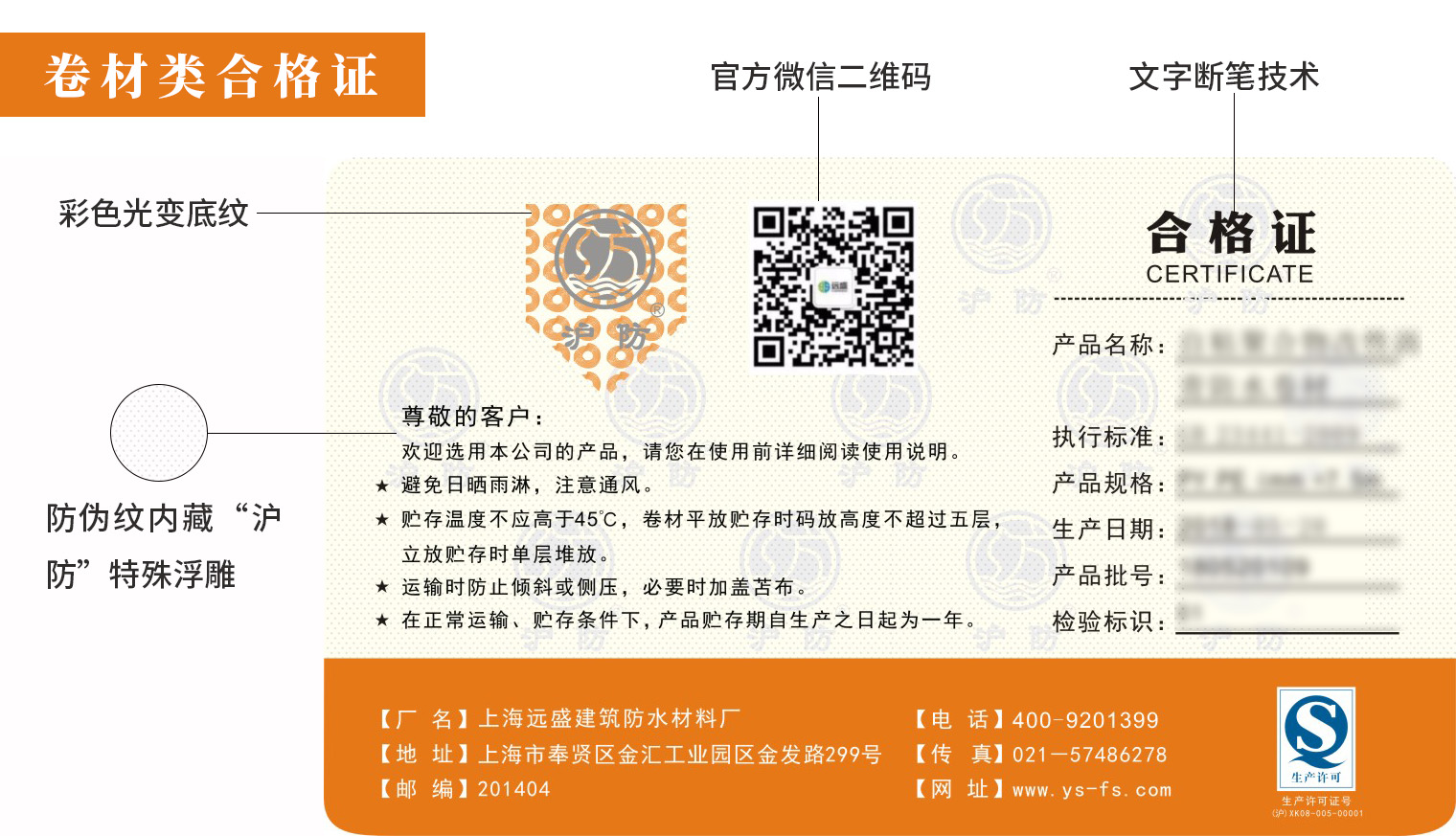 防伪合格证:采用彩色光变底纹、文字断笔等多重科学防伪技术,无法仿制。