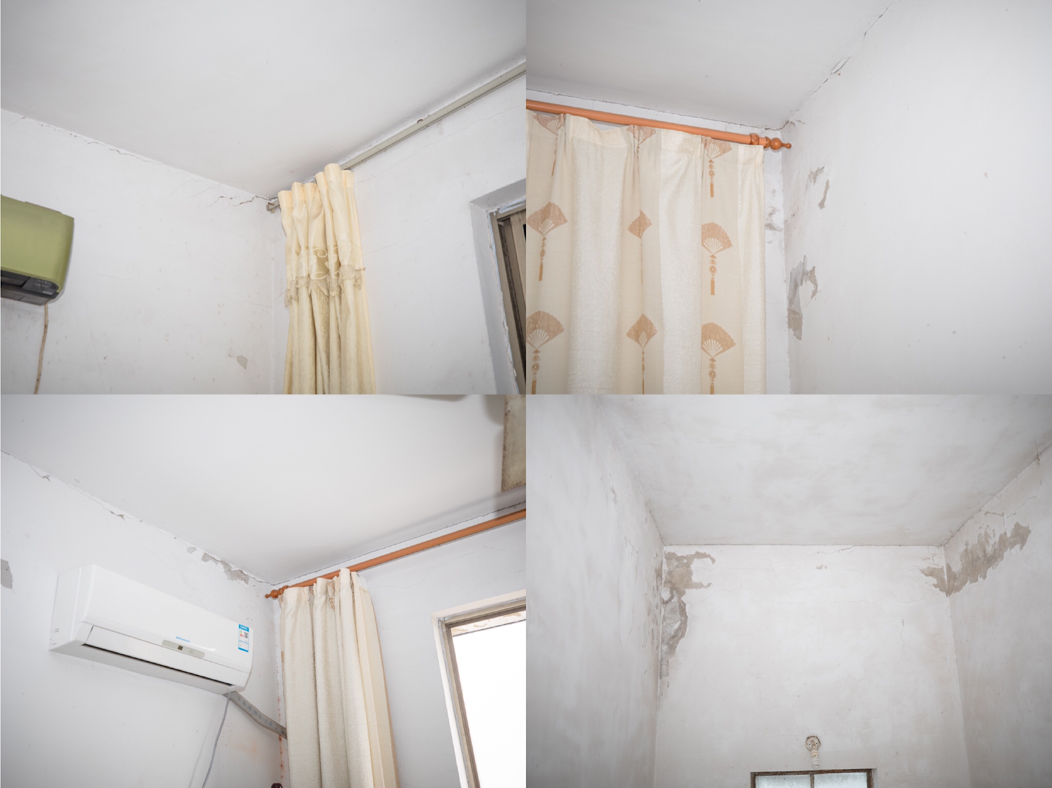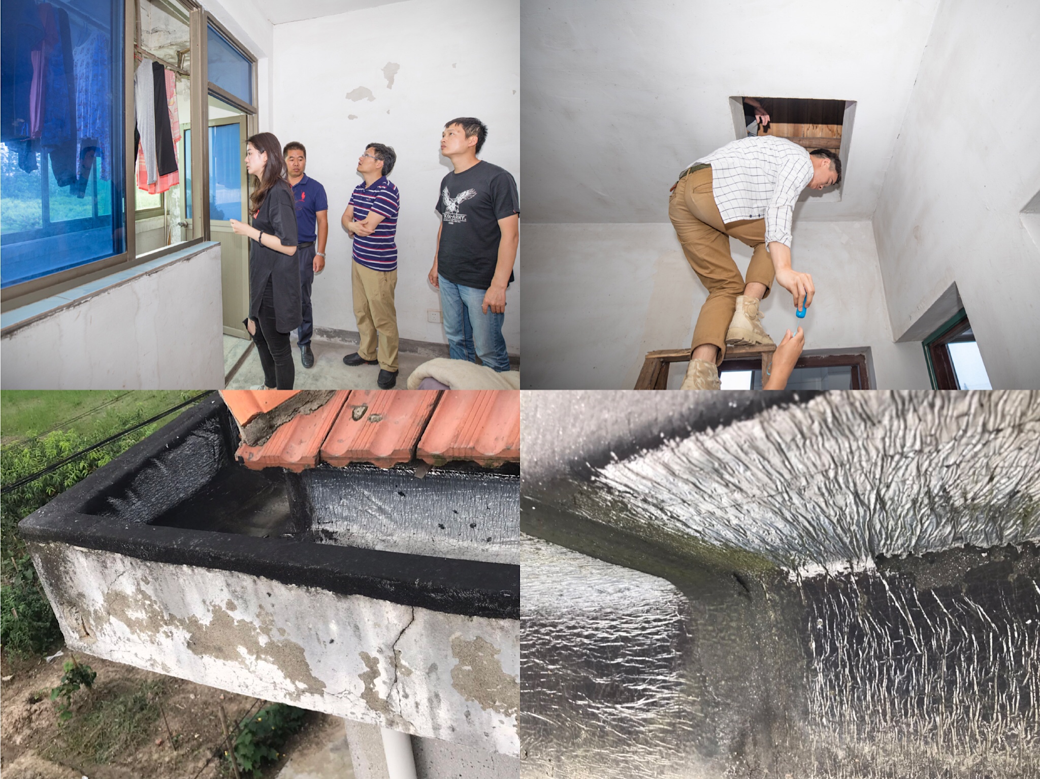 在寻访的时候,我们看到了房屋存在着很多的问题,我们的工程师也特地爬上了梯子看了下屋顶内部的问题。由于建筑物所处地面的不均匀沉降以及年久失修,房屋局部出现了较为严重的裂缝,下雨时,雨水沿着缝隙渗漏到室内,导致大面积起皮、墙体泛黄,严重影响住户的正常生活。通过室内和屋面现场的勘察发现,屋面原防水层基本保持良好,局部存在老化和剥离现象。漏水主要原因为檐沟外立面出现多处开裂,原防水层未将其包裹住(在遇暴雨,出现排水不畅时,积水易漫过檐沟,通过开裂的缝隙渗漏到室内),所以在接下来的维修工作当中,这是重点和难点,也是我们需要去攻克的工作。