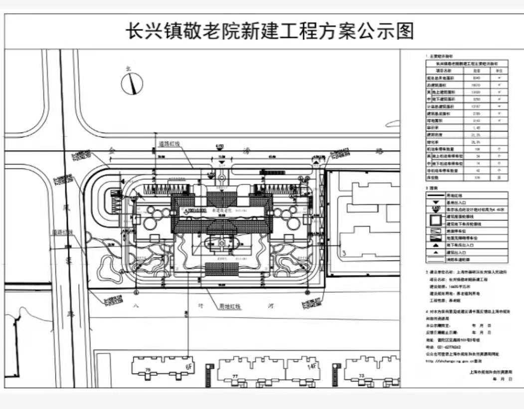 项目介绍:项目位于崇明区长兴镇G9CM-0401单元40-01地块,北至金滂路,东至长丰幼儿园, 南至八圩河,西至凤蓉路。规划建设用地面积:8949平方米,规划总建筑面积:16670平方米,其中计容建筑面积:13197平方米,容积率:1.48,建筑密度31.2%,绿地率35%,建筑高度及层数:新建1幢地上6层(局部2层)敬老院,建筑高度23.95米(局部10.40米);1幢地上1层垃圾房,高度6.25米。
