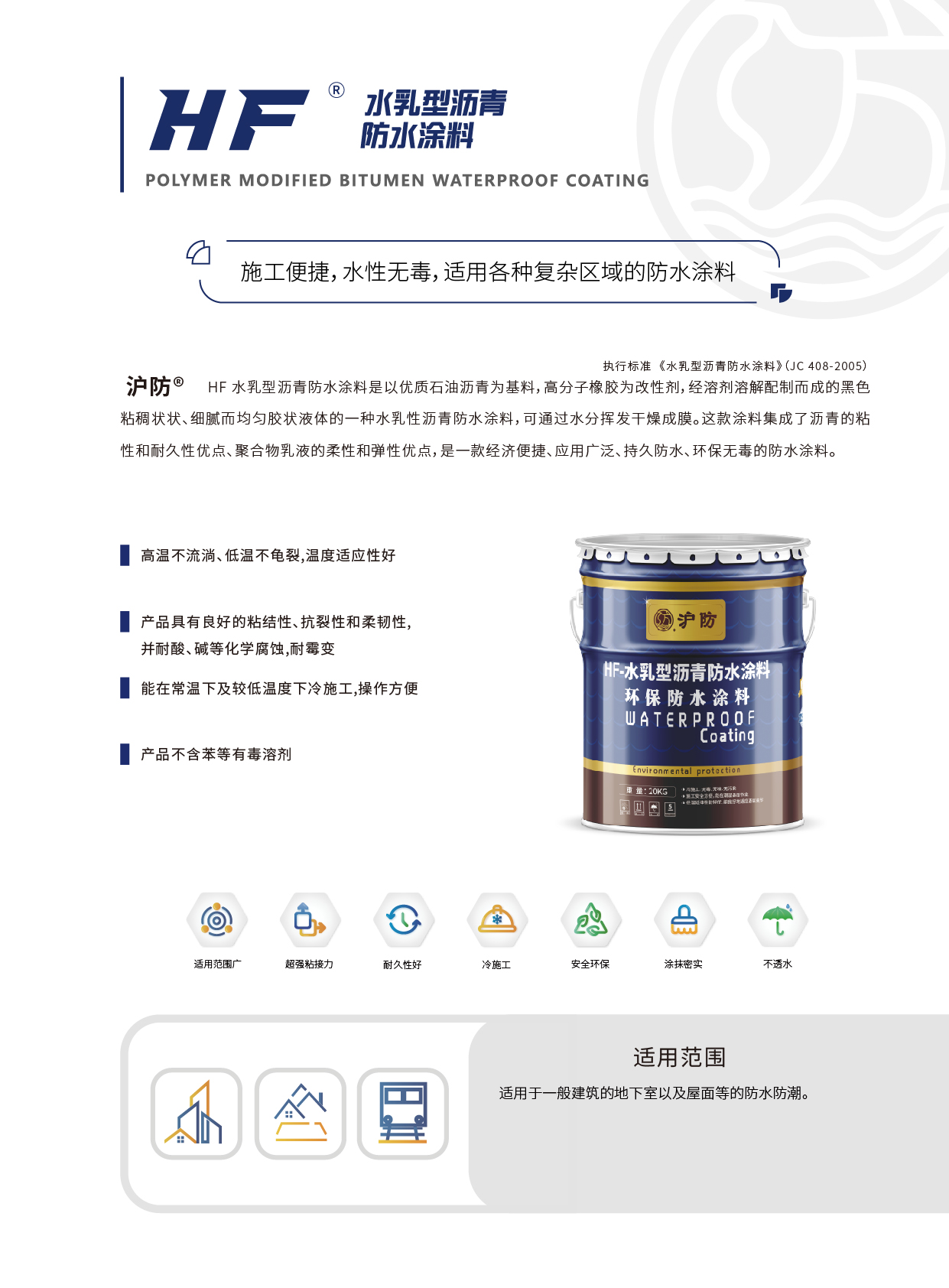HF 水乳型沥青防水涂料是以优质石油沥青为基料,高分子橡胶为改性剂,经溶剂溶解配制而成的黑色粘稠状状、细腻而均匀胶状液体的一种水乳性沥青防水涂料。