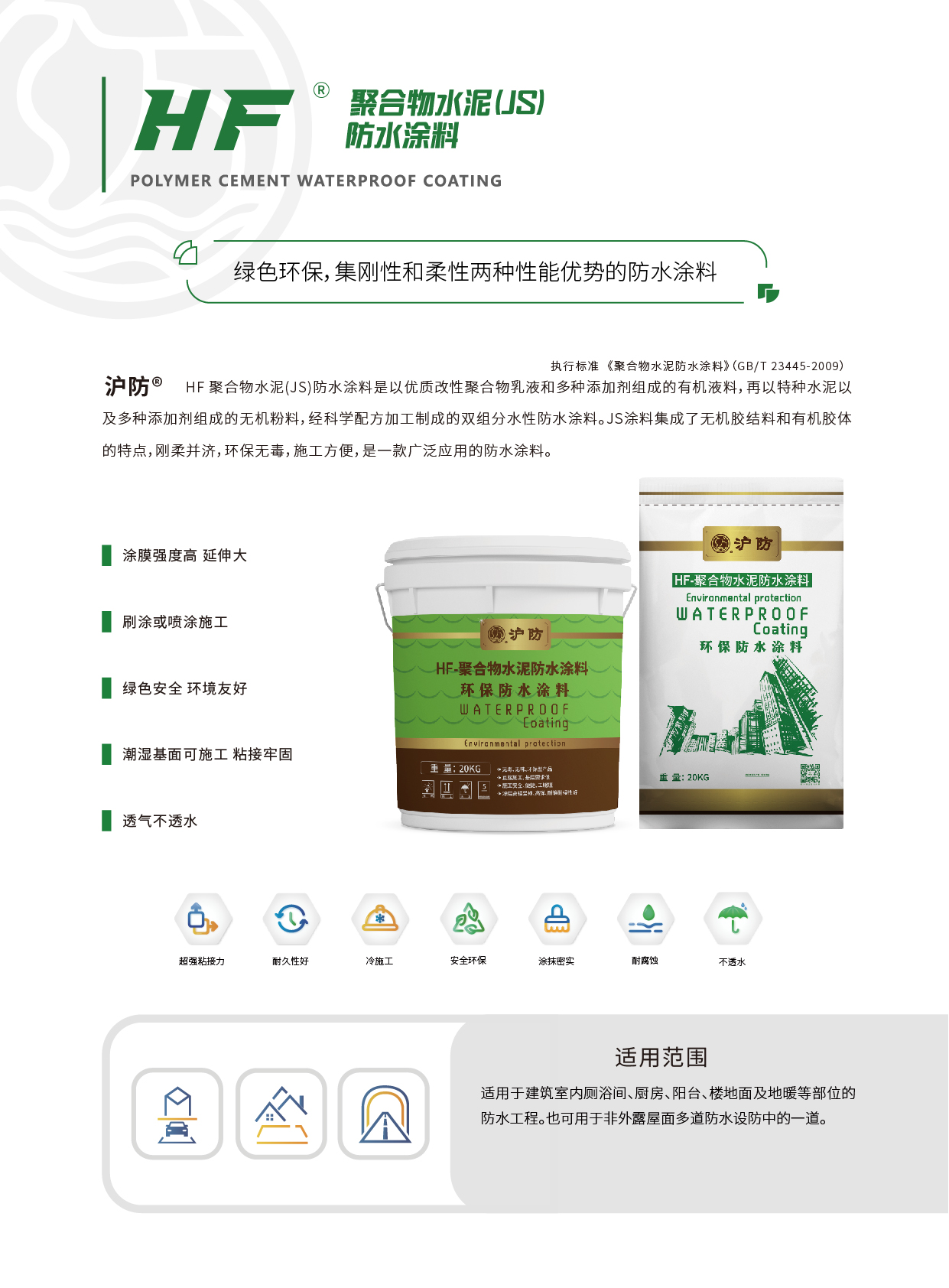 HF 聚合物水泥(JS)防水涂料是以优质改性聚合物乳液和多种添加剂组成的有机液料,再以特种水泥以及多种添加剂组成的无机粉料,经科学配方加工制成的双组分水性防水涂料。