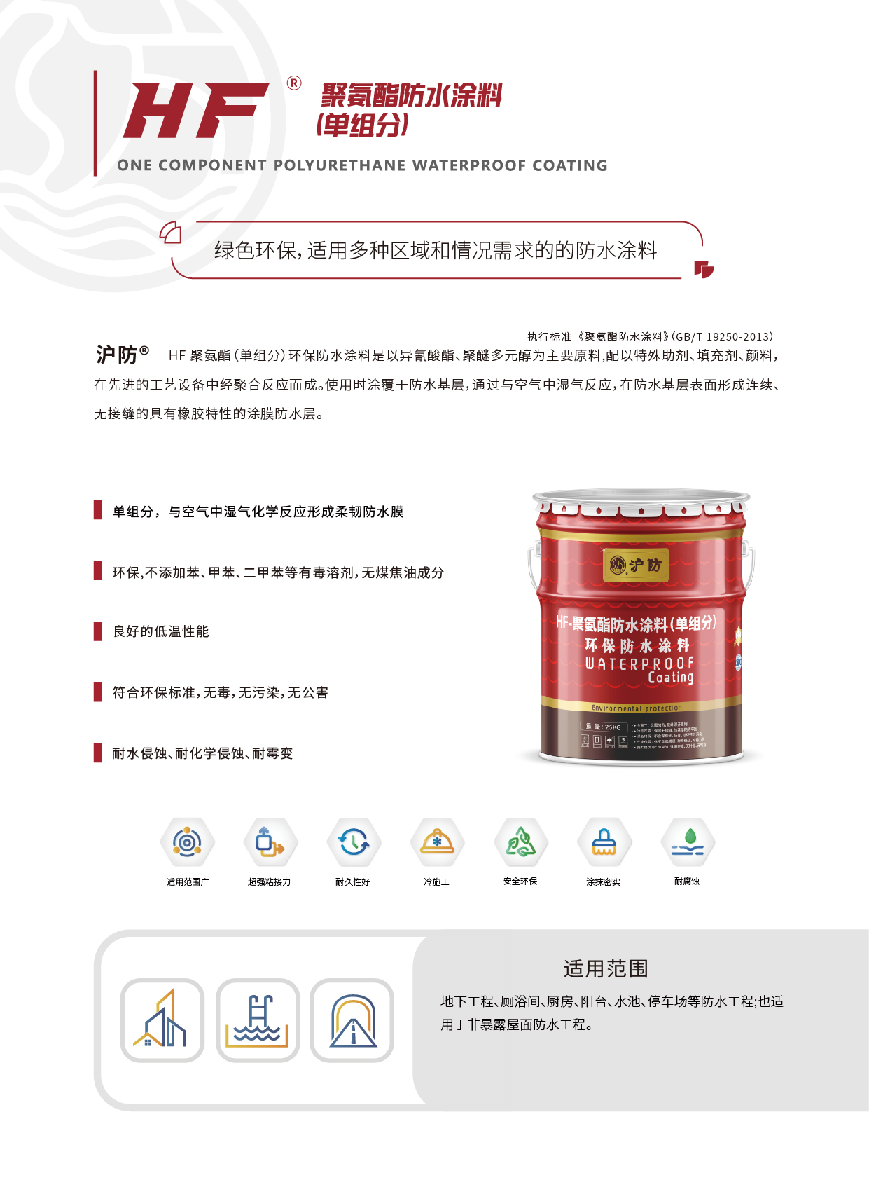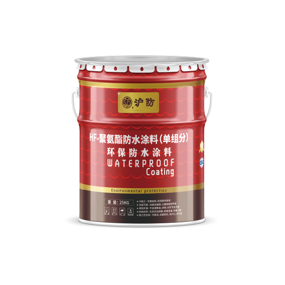 HF 聚氨酯防水涂料(单组分)是以异氰酸酯、聚醚多元醇为主要原料,配以特殊助剂、填充剂、颜料,在先进的工艺设备中经聚合反应而成。使用时涂覆于防水基层,通过与空气中湿气反应,在防水基层表面形成连续、无接缝的具有橡胶特性的涂膜防水层。