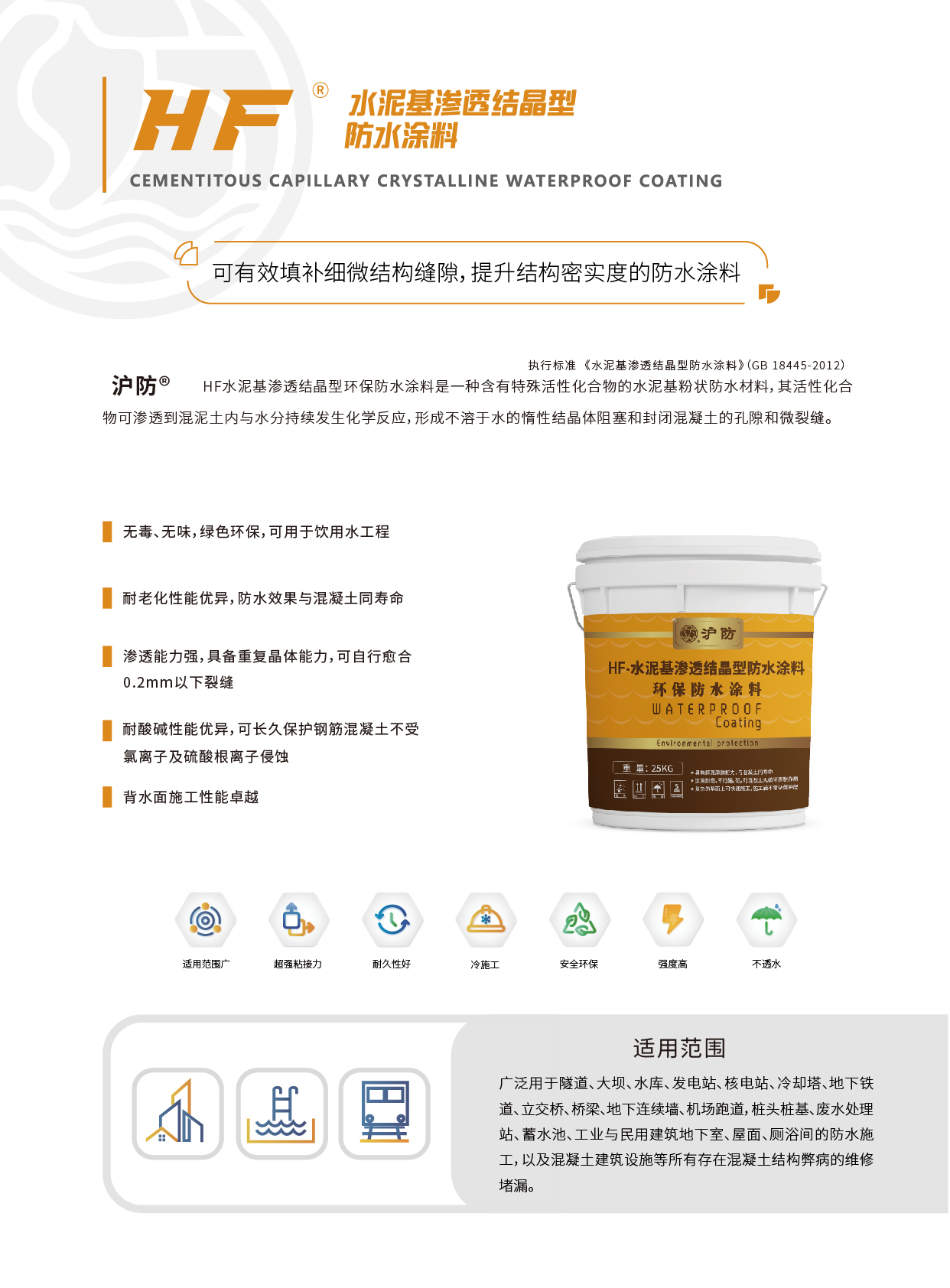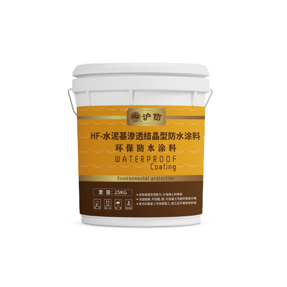 HF 水泥基渗透结晶型防水涂料是一种含有特殊活性化合物的水泥基粉状防水材料,其活性化合物可渗透到混泥土内与水分持续发生化学反应,形成不溶于水的惰性结晶体阻塞和封闭混凝土的孔隙和微裂缝。