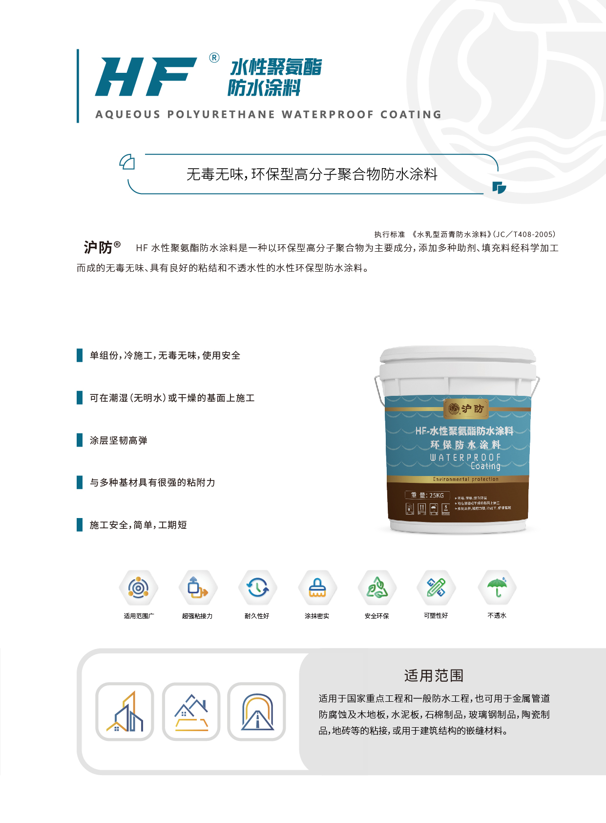 HF 水性聚氨酯防水涂料是一种以环保型高分子聚合物为主要成分,添加多种助剂、填充料经科学加工而成的无毒无味、具有良好的粘结和不透水性的水性环保型防水涂料。