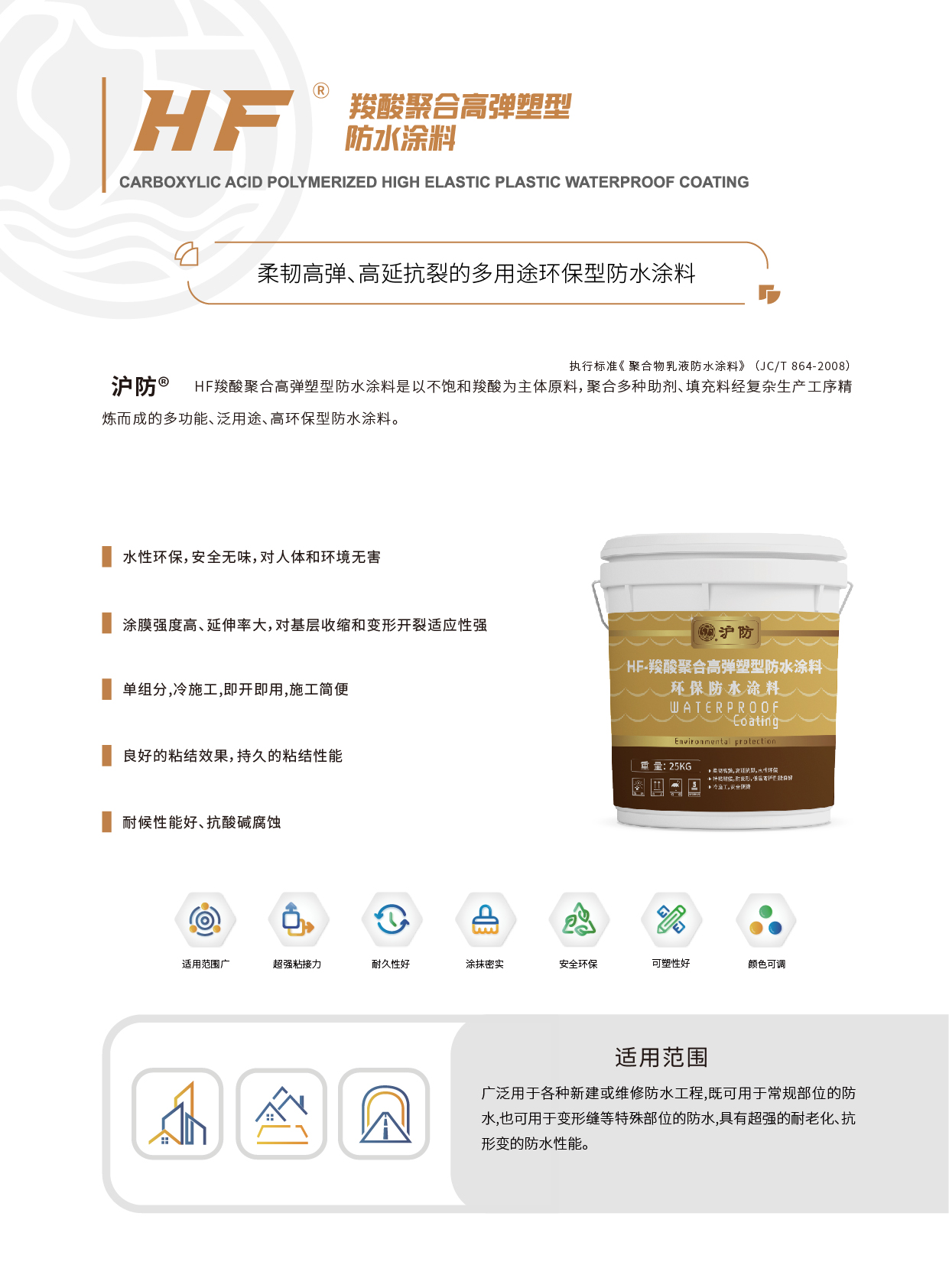 HF 羧酸聚合高弹塑型防水涂料是以不饱和羧酸为主体原料,聚合多种助剂、填充料经复杂生产工序精炼而成的多功能、泛用途、高环保型防水涂料。