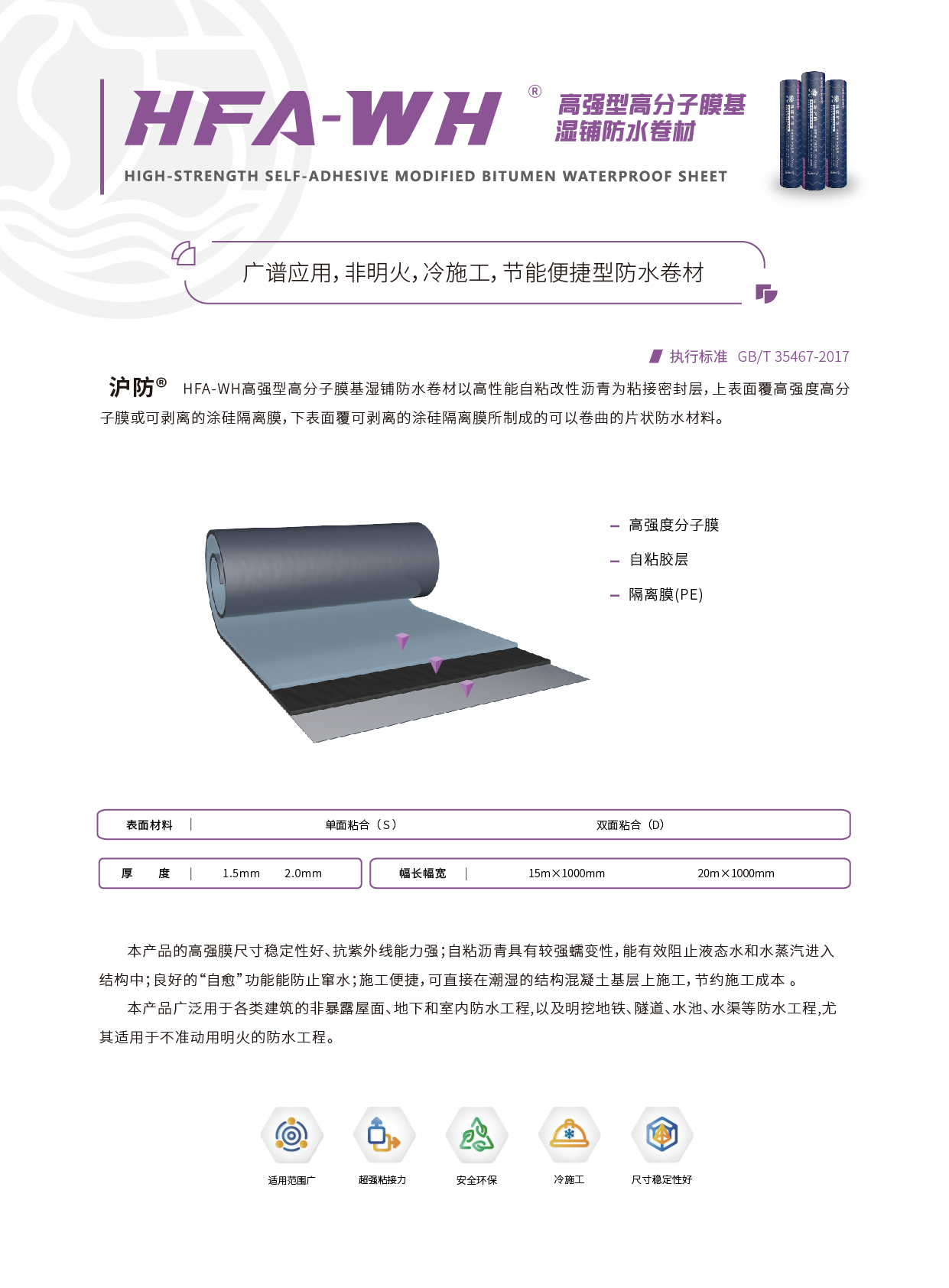 HFA-WH高强型高分子膜基湿铺防水卷材以高性能自粘改性沥青为粘接密封层,上表面覆高强度高分子膜或可剥离的涂硅隔离膜,下表面覆可剥离的涂硅隔离膜所制成的可以卷曲的片状防水材料。