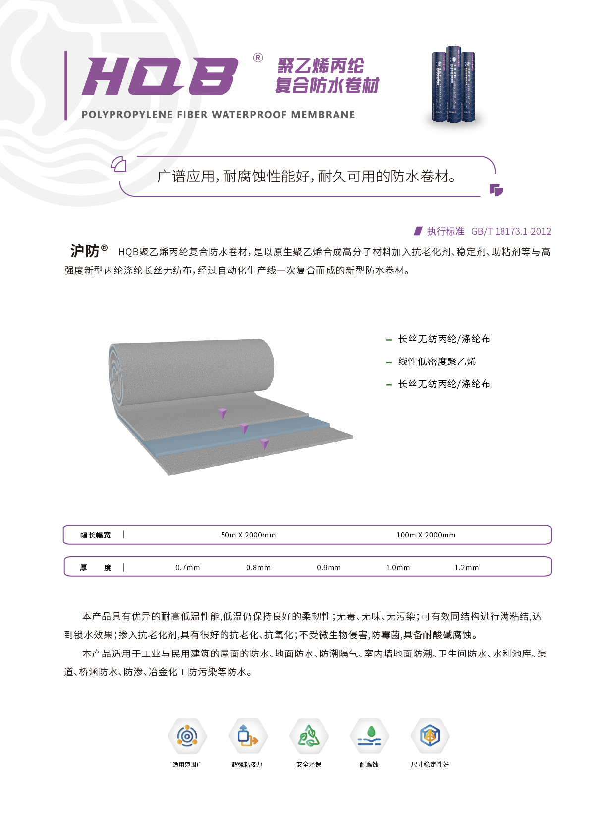 HQB 聚乙烯丙纶复合防水卷材,是以原生聚乙烯合成高分子材料加入抗老化剂、稳定剂、助粘剂等与高强度新型丙纶涤纶长丝无纺布,经过自动化生产线一次复合而成的新型防水卷材。