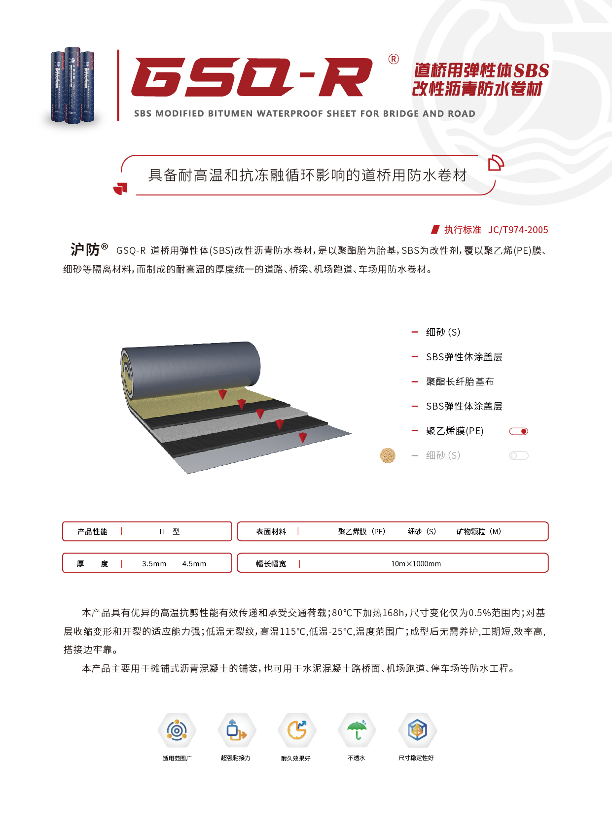 GSQ-R 道桥用弹性体SBS改性沥青防水卷材,是以聚酯胎为胎基,SBS为改性剂,覆以聚乙烯(PE)膜、细砂等隔离材料,而制成的耐高温的厚度统一的道路、桥梁、机场跑道、车场用防水卷材。