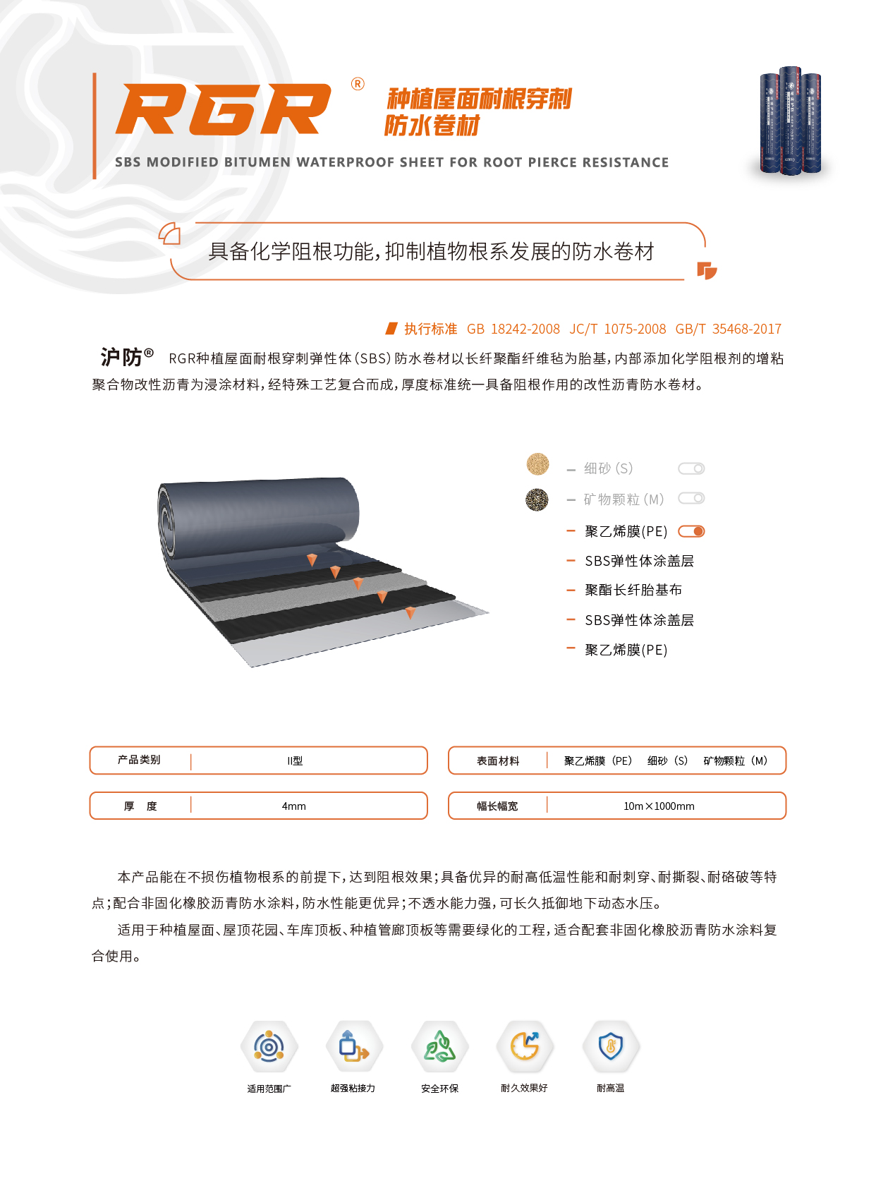 RGR 种植屋面耐根穿刺防水卷材以长纤聚酯纤维毡为胎基,内部添加化学阻根剂的 增粘聚合物改姓沥青为浸涂材料,经特殊工艺复合而成,厚度标准统一具备阻根作用的自粘防水卷材。